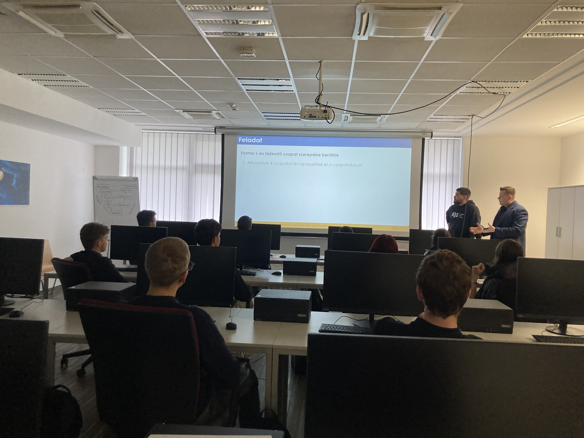 Ezután egy játékos verseny keretében egy szimulátorprogram segítségével tesztelték a diákok, hogy a különböző futási paraméterek manipulálásával hogyan növelhető egy jármű sebessége. Az külön tetszett a középiskolásoknak, hogy két fiatal, nálunk végzett járműmérnök oktatónk vezette a játékot és friss, széleskörű szakmai tudásukkal elkápráztatták a diákokat. A nyertes csapat egyetemi baseball sapkát kapott ajándékba.